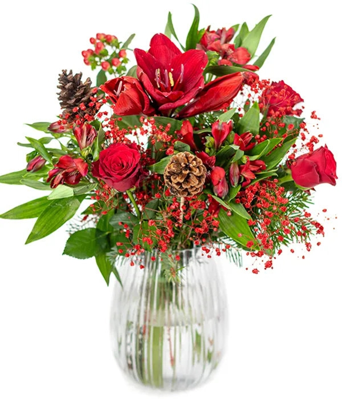 Bring the charm and warmth of Christmas into your loved one's home with our Festive Pines & Petals flat cello bouquet. Featuring radiant red roses, alstroemeria, hypericum, vibrant amaryllis, and touches of seasonal greenery. (image for illustration purpose only, vase not included)