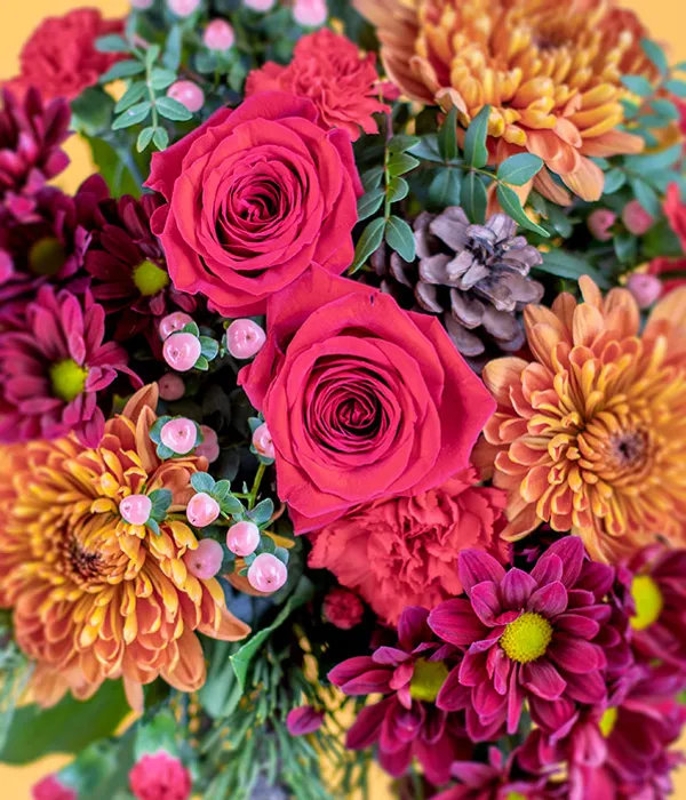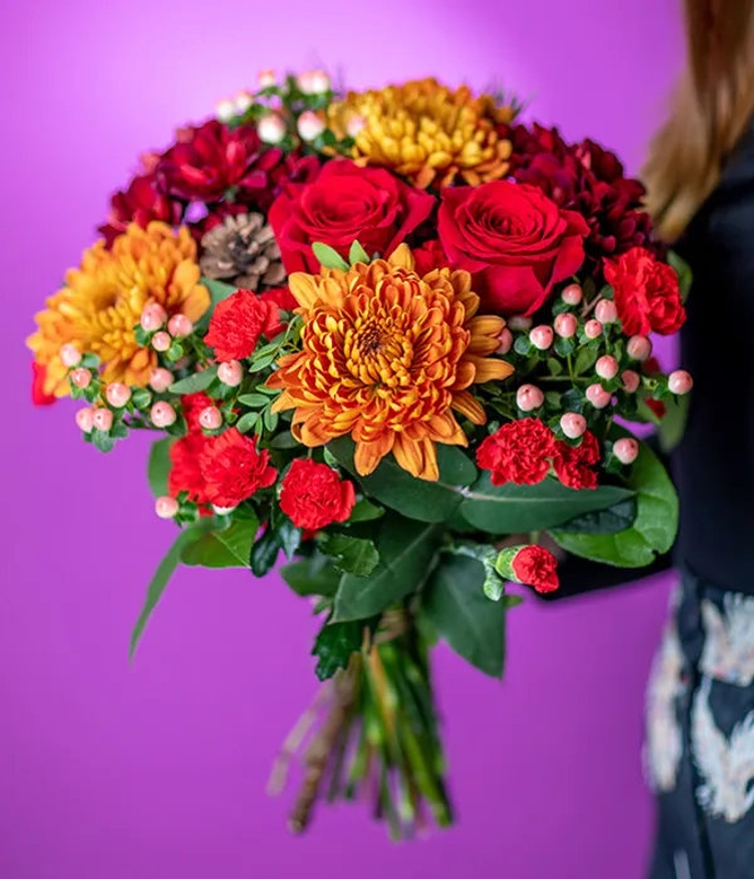 A bright and beautiful festive traditional cello wrapped bouquet! This arrangement is filled with red spray carnations, orange blooms, chrysanthemum, hypericum, pine cones, spruce and seasonal foliage.(Image for illustration purpose only, vase not included)